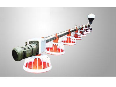 由料斗、输料管、绞龙、料盘、悬挂升降装置、电机和料位传感器组成。其主要功能是把料斗中的料输送到每个料盘中去,保证肉鸡的食用,并由料位传感器来自动控制电机的输送启闭,达到自动送料的目的。